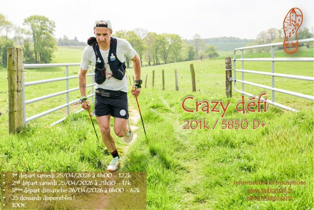 Crazy défi : 201k comprenant le RadiCassant (122k) le samedi matin, le RadiNocTrail (17k nocturne) le samedi soir et le RadiCal’Trail (62k) le dimanche matin