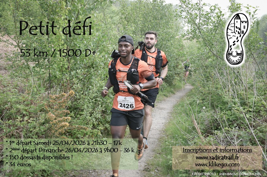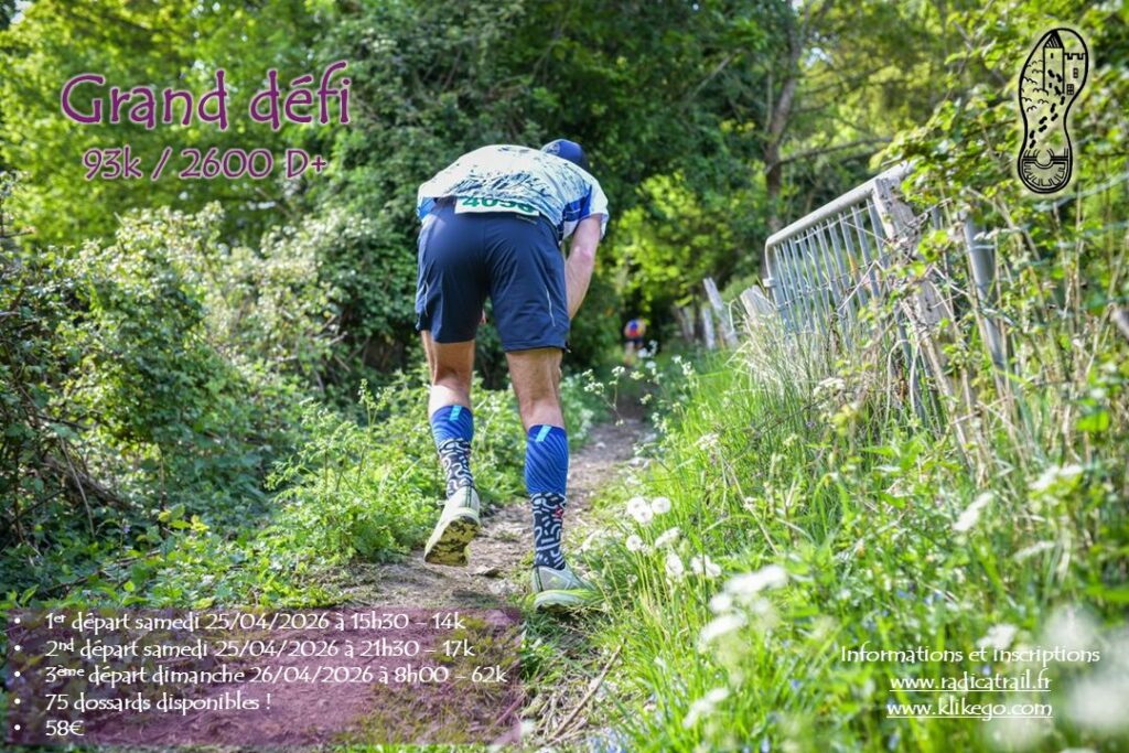 Grand défi : 93k comprenant le RadiPtiTrail (14k) le samedi après-midi, le RadiNocTrail (17k nocturne) le samedi soir et le RadiCalTrail (62k) le dimanche matin